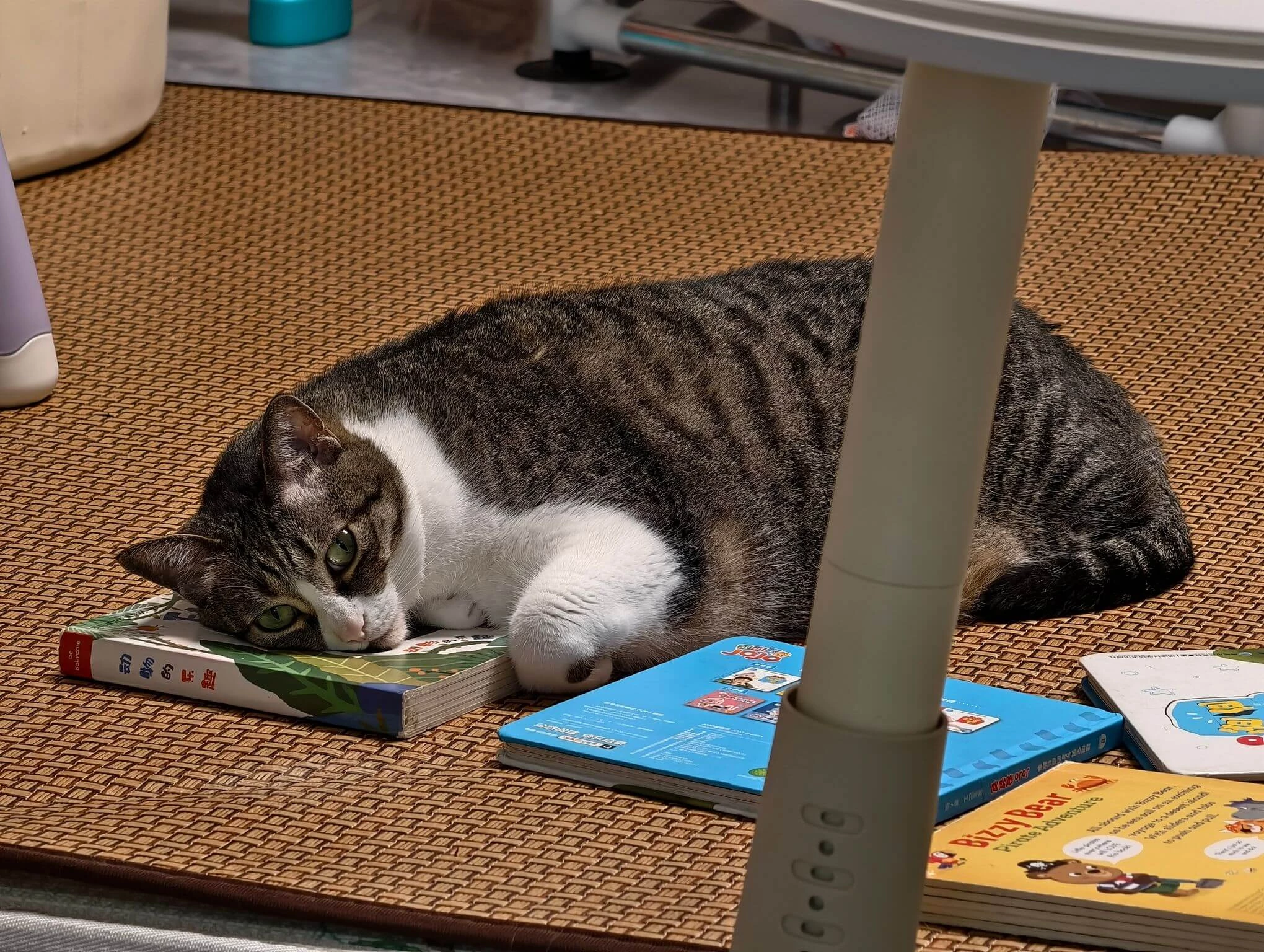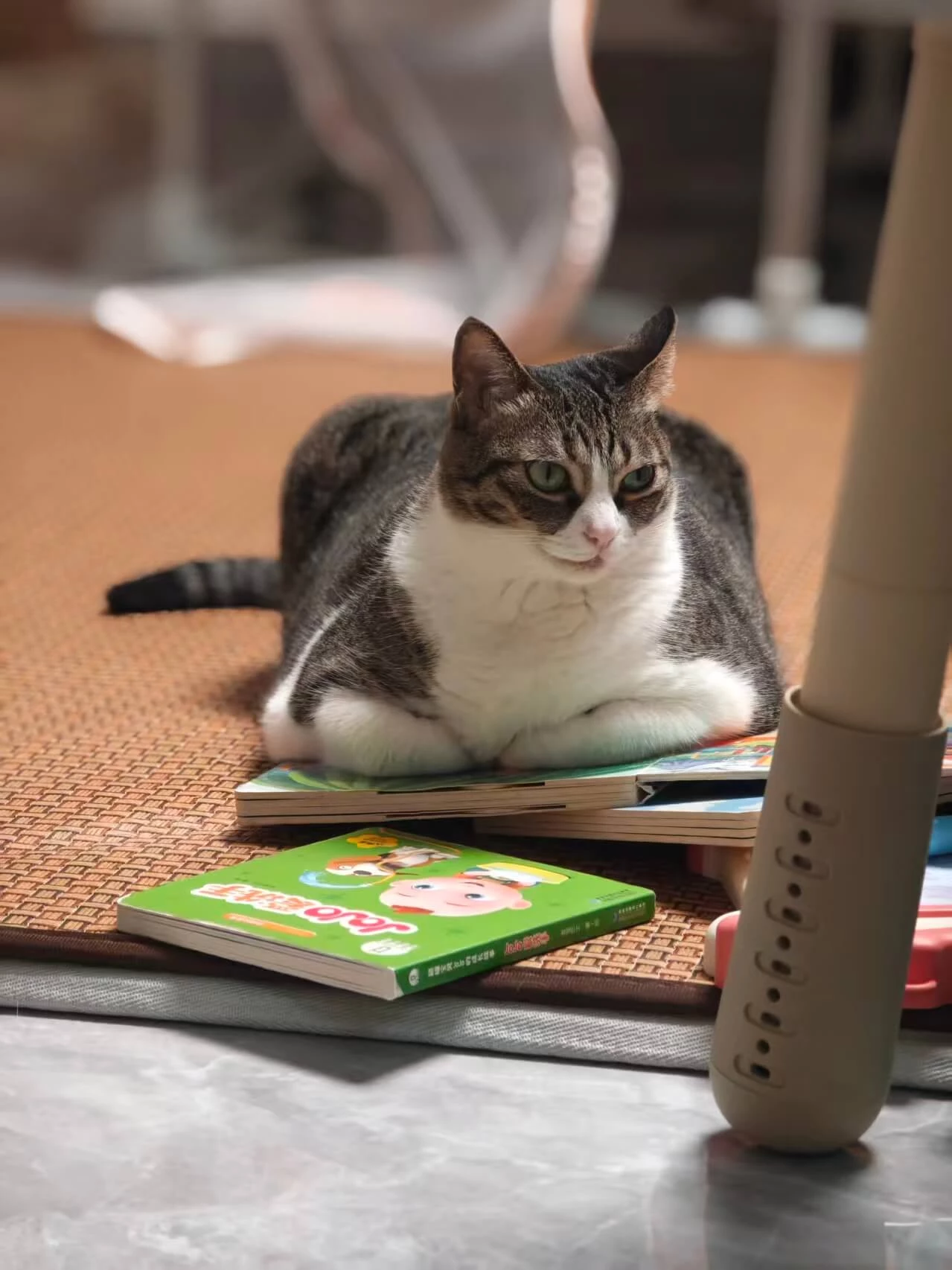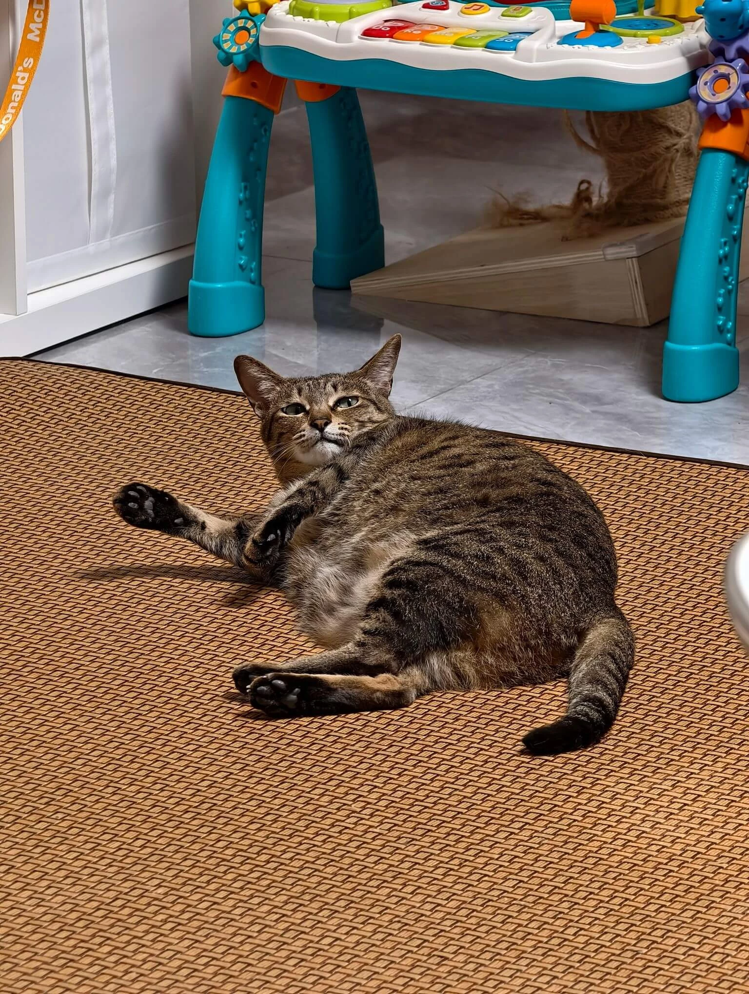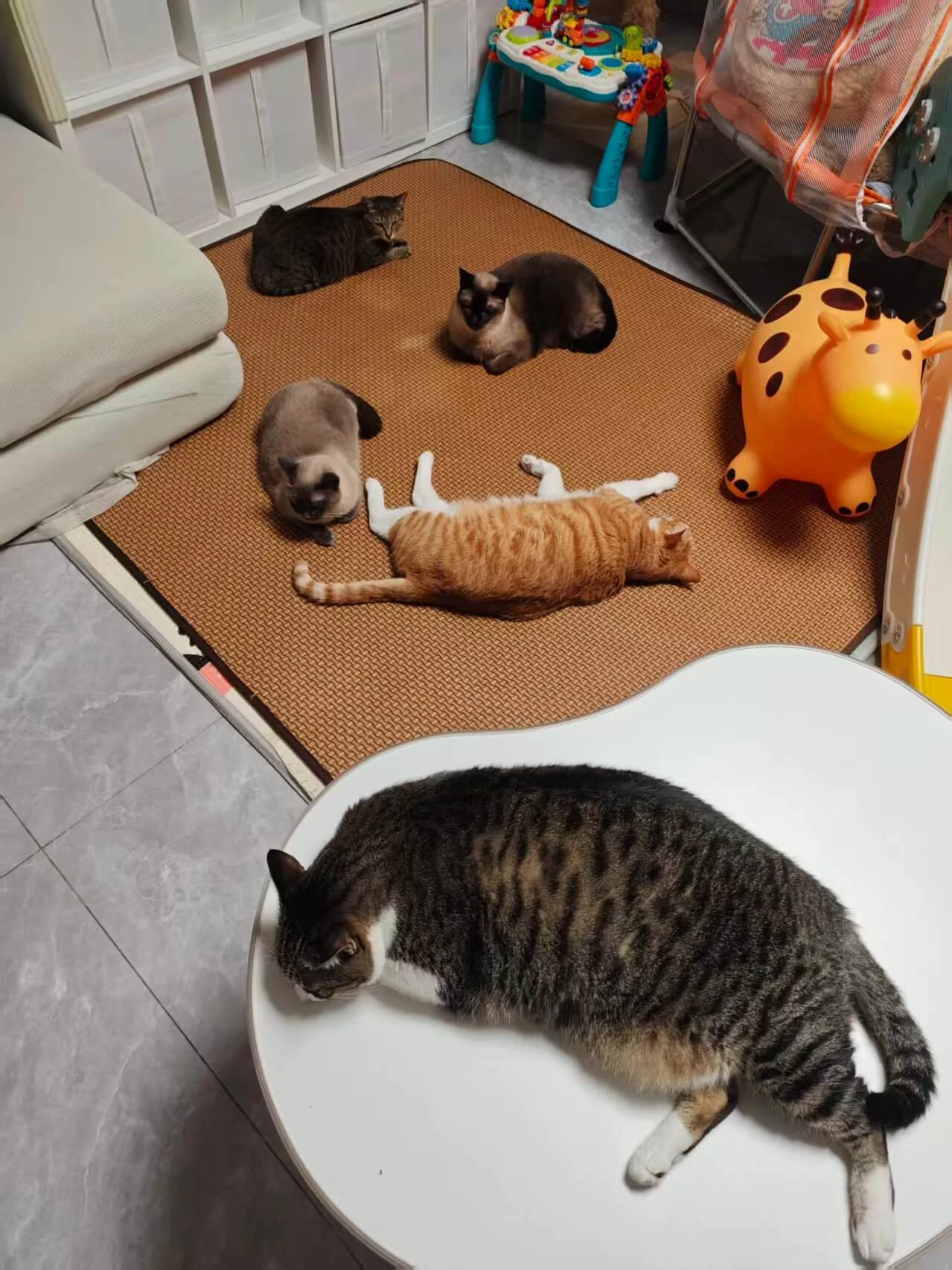 夏天买了一张草席铺在地上给小朋友当游戏毯,小祖宗还没有用上呢,猫主子表示很满意都躺上了,养猫和养小孩都能物尽其用,凉席棒棒的!